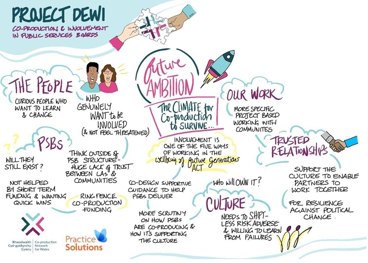 Project Dewi is a five-year national initiative led by the Co-Production Network for Wales, which supports Public Services Boards (PSBs) across Wales to embed co-production and meaningful involvement in how decisions are made. The programme has worked with PSBs to move beyond consultation towards genuine collaboration with communities.